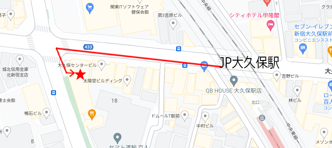 大久保駅「北口」から出て正面の「大久保通り」を左へ進みます。一つ目の信号「北新宿一丁目」手前左手角の建物4階に当店が入っています。建物の入口は信号手前を左折するとあります。